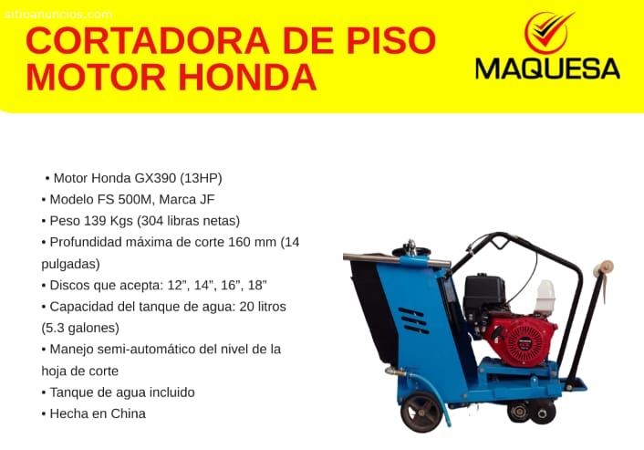 Cortadora de piso, JF-HONDA GX390, De fabricación China, acoplada a motor HONDA GX390 de 13 hp. Acepta discos de 12, 14, 16 y 18 Pulgadas. Peso de todo el equipo 139 Kgs (304 Lbs). Profundidad maxima de corte 160mm (14 Pulg). de facil operación, manejo semi automatico del nivel de la hoja de corte. Tanque de agua incluido, capacidad 20 Lts (5.3 galones). Gratis un disco Multi propositos de 14 Pulg. Invierte en un Equipo muy eficiente US$2,595.00 iva incluido. Inf. Cell. 7555-8227
