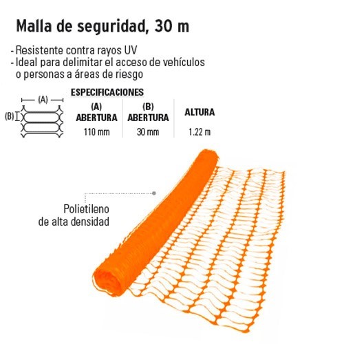 Mallas delimitantes rollo de 30 Mts. de polietileno color naranja. Dimensiones, Largo 30 Mts. Altura 1.22 Mts. Abertura 110 mm X 30 mm. Util para delimitar áreas de trabajo y proporciona seguridad y protección en el acceso de personas y vehiculos en zonas de alto riesgo. Hecha de polietileno de alta densidad, resistente a los rayos UV. Excelente para la industria de la construcción, diversas industrias y otros lugares donde se demande su uso. Inversión US$30.00 iva incluido Inf. Cell. 7555-8227