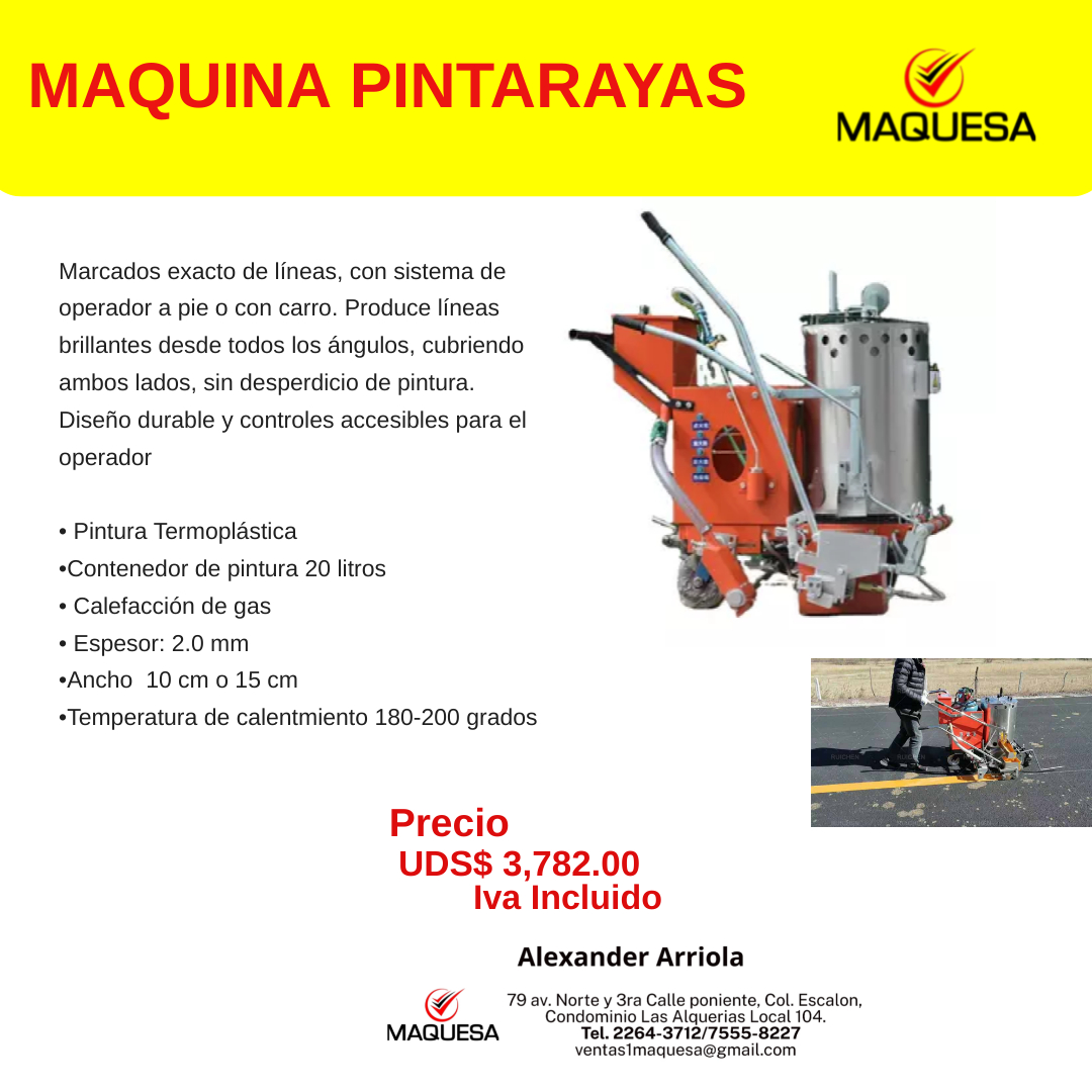 Maquina Pinta Rayas JF China. Pinta en caliente con pintura termoplastica. Esta maquina produce lineas brillantes desde todos los angulos. Marcado exacto de lineas, cubriendo ambos lados sin desperdicio de pintura. Contenedor de pintura de 20 Litros, calefacción de gas propano. Controles accesibles al operador. Diseño durable. La herramienta ideal para marcado de lineas en calles y parqueos en residenciales y centros comerciales. Inversión US$3,782.00 Inf. Cell. 7555-82273782